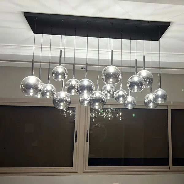 Deze indrukwekkende hanglamp met maar liefst 17 bollen van smoke-glas is een absolute blikvanger in ieder interieur. De glazen bollen variëren in afmeting van 12 tot 18 cm, wat zorgt voor een speels en dynamisch effect. Het elegante rookglas verspreidt een warme en sfeervolle gloed, perfect voor boven de eettafel, in de woonkamer of boven een kookeiland.