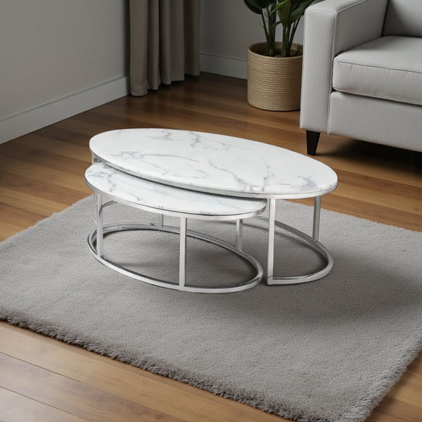 Marmeren Design Salontafels Ovaal 2 Stuks met RVS Poten – Stevige en Verschuifbare Zilver Salontafels voor de Woonkamer