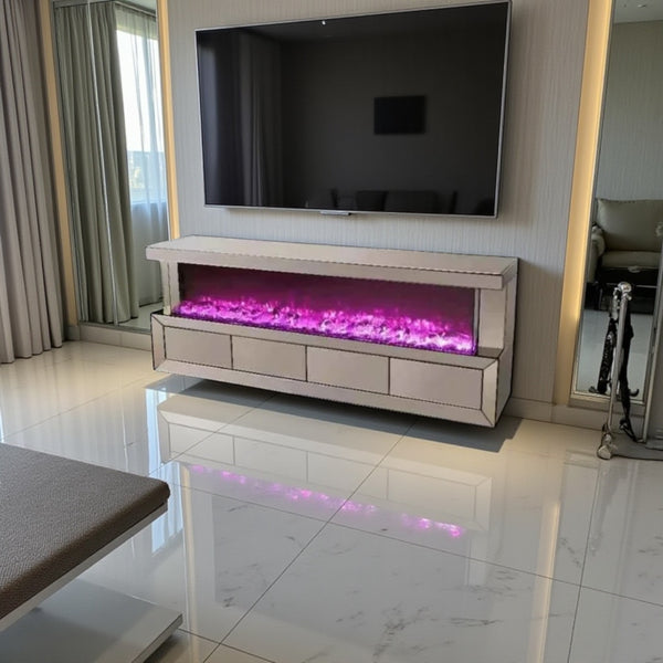 Breng sfeer en functionaliteit samen met dit luxe grijsgekleurde elektrische tv-meubel met geïntegreerde sfeerhaard. De moderne afwerking in neutraal grijs past perfect in zowel strakke als warme interieurs. Het meubel is voorzien van vier praktische lades, ideaal voor het netjes opbergen van accessoires, kabels of afstandsbedieningen.