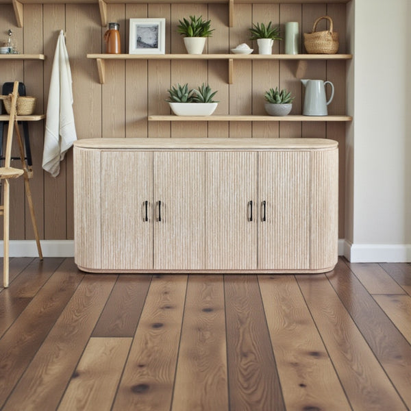 Met zijn vier deuren biedt dit dressoir ruime opbergmogelijkheden, ideaal voor het netjes opbergen van servies, linnengoed of woonaccessoires. De strakke lijnen en greeploze deuren benadrukken de minimalistische vormgeving, terwijl de verhoogde hoogte zorgt voor een statige, moderne uitstraling in de ruimte.