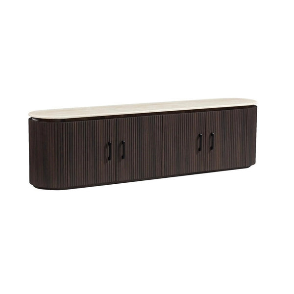 Dit elegante Japandi TV-meubel combineert natuurlijke materialen met een tijdloos, minimalistisch design. Het blad is vervaardigd uit prachtig  travertin, dat met zijn zachte bruine tinten en subtiele aders een warme, verfijnde uitstraling geeft aan het meubel. De natuurlijke textuur van het gesteente vormt een prachtig contrast met de strakke lijnen van het ontwerp.