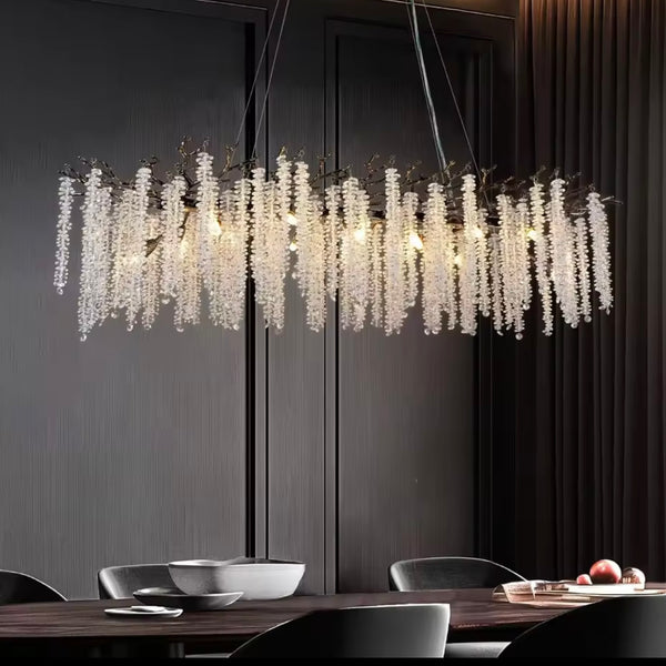 De zilverkleurige omlijsting geeft de lamp een verfijnde, moderne uitstraling die prachtig combineert met de fonkelende kristallen. Dankzij de in hoogte verstelbare ophanging kan de lamp eenvoudig worden aangepast aan de gewenste positie, waardoor hij perfect tot zijn recht komt boven een eettafel, kookeiland of in een stijlvolle entree.