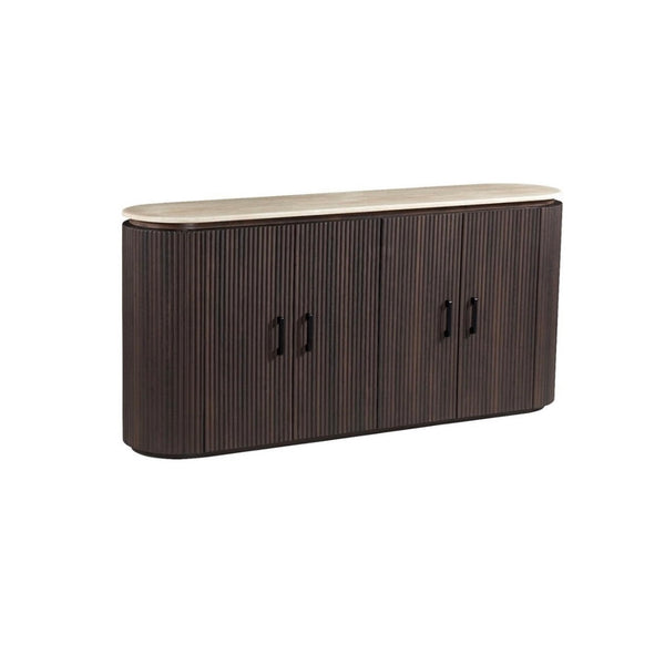 Dit stijlvolle Japandi dressoir combineert natuurlijke rust met verfijnde elegantie. De warme bruine afwerking en het prachtige travertin blad vormen samen een harmonieus geheel dat perfect past binnen de Japandi-filosofie van eenvoud, balans en natuurlijke schoonheid.